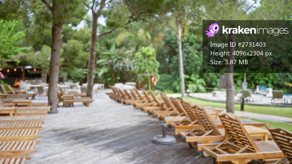 Blurred image of a tropical luxury resort with wooden lounge chairs on a sunlit deck surrounded by lush greenery and palm trees, creating a serene outdoor atmosphere. - Kraken Images