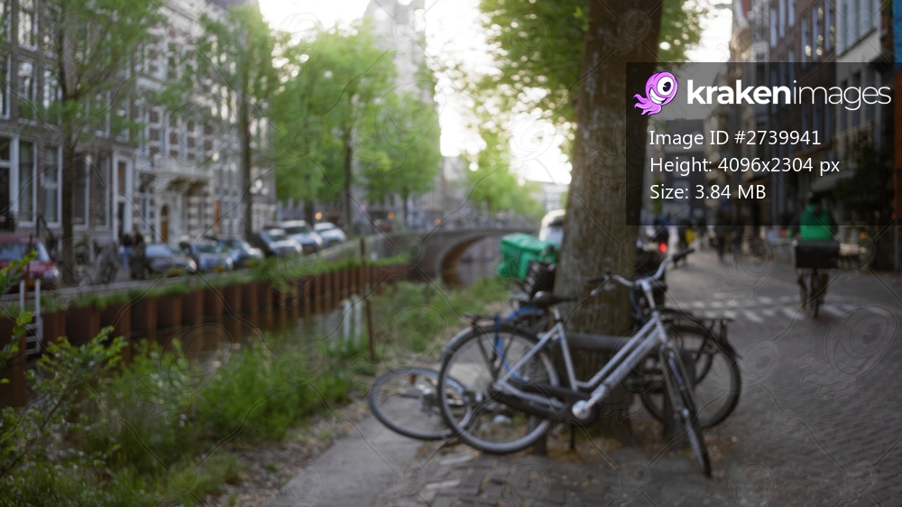 Blurred image of bicycles resting against a tree along the picturesque canal in amsterdam, netherlands with people commuting and buildings visible in the background. - Kraken Images