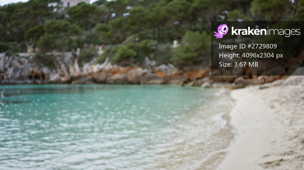 Blurred image of cala gat beach in mallorca with defocused turquoise water, soft sand, and lush greenery, evoking a serene, tranquil, vacation atmosphere. - Kraken Images