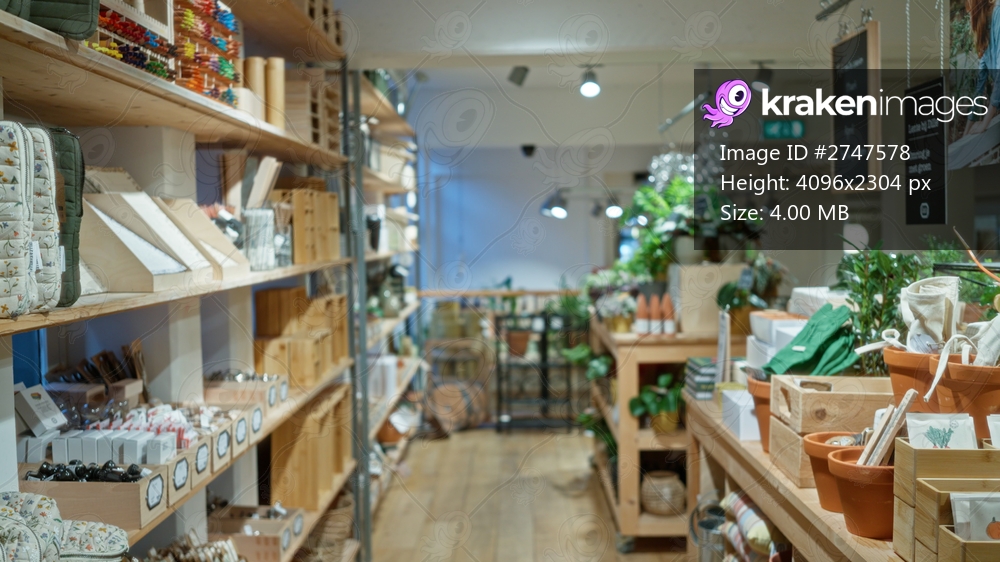 Blurred indoor shop scene showcases decor items on wooden shelves with vibrant bokeh effect, offering an inviting shopping experience amidst carefully arranged displays.