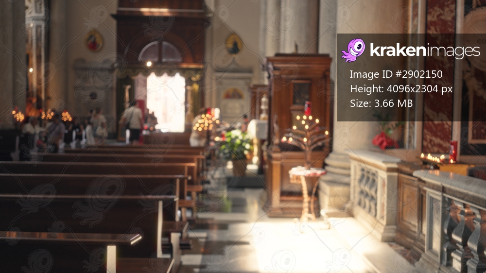 Blurred interior church nave with shallow bokeh and defocused pews and candles background; background backdrop copyspace.
