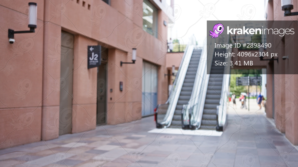 Blurred interior passage with twin escalators and terracotta facades in soft focus plaza; background template overlay.
