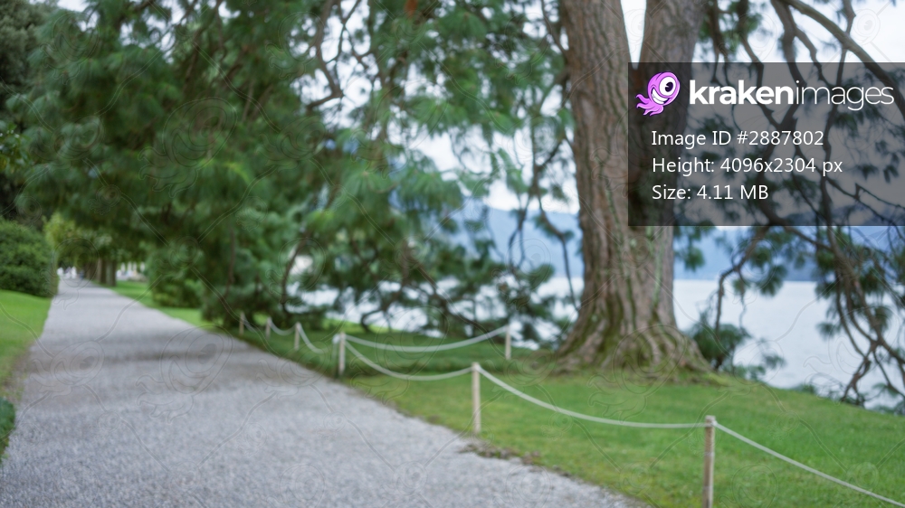 Blurred lakeside pathway with defocused trees and gravel foreground in a park; background backdrop copyspace calm.