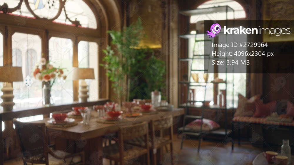 Blurred living room scene with defocused view of an indoor dining area showcasing warm, cozy decor and natural light through large windows framed by elegant woodwork. - Kraken Images