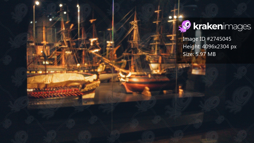 Blurred model ships displayed in a dimly lit museum exhibit with intricate details captured through a glass case providing a historical maritime visual experience. - Kraken Images