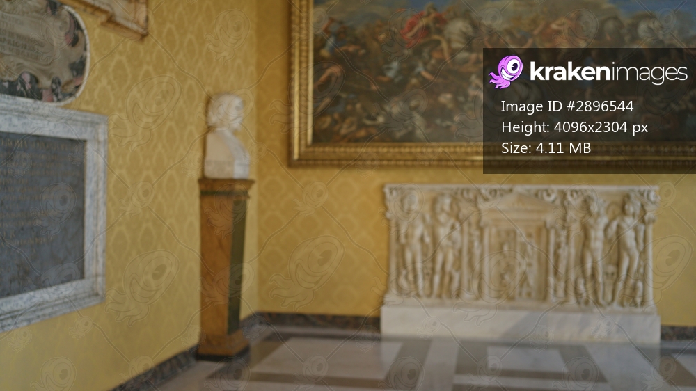Blurred museum interior showing an ornate gilded painting, marble sarcophagus and patterned gold wallpaper in soft focus; background, backdrop, copyspace.