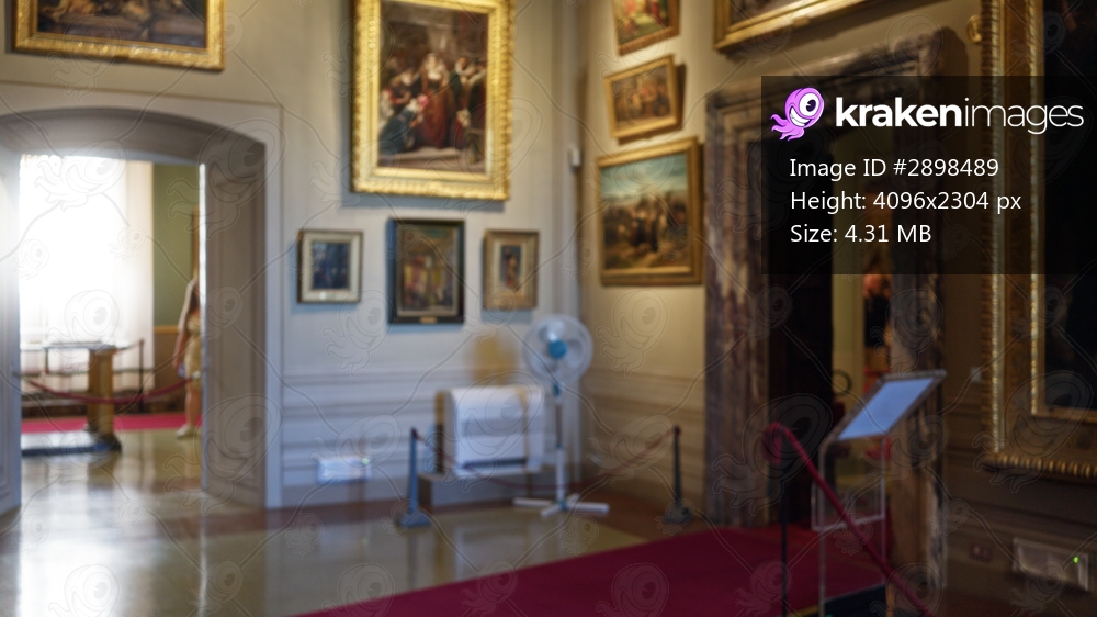 Blurred museum interior with soft bokeh, framed paintings and ropes, shallow focus on gallery doorway; background backplate copyspace.