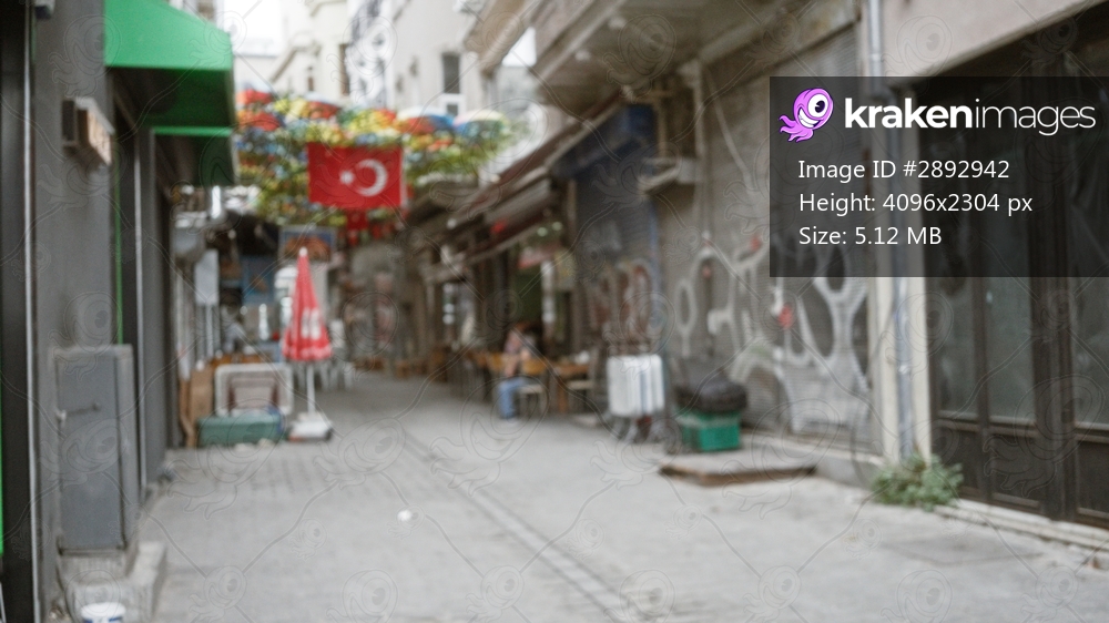 Blurred narrow alley street scene with shallow focus, defocused storefronts, graffiti and outdoor cafe seating, turkish flag visible; background backdrop copyspace. - Kraken Images