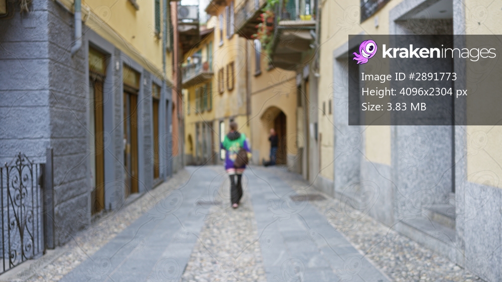 Blurred narrow cobblestone alley with historic building facades and stone pavement, soft defocused shallow bokeh alley background; background backplate copyspace calm.