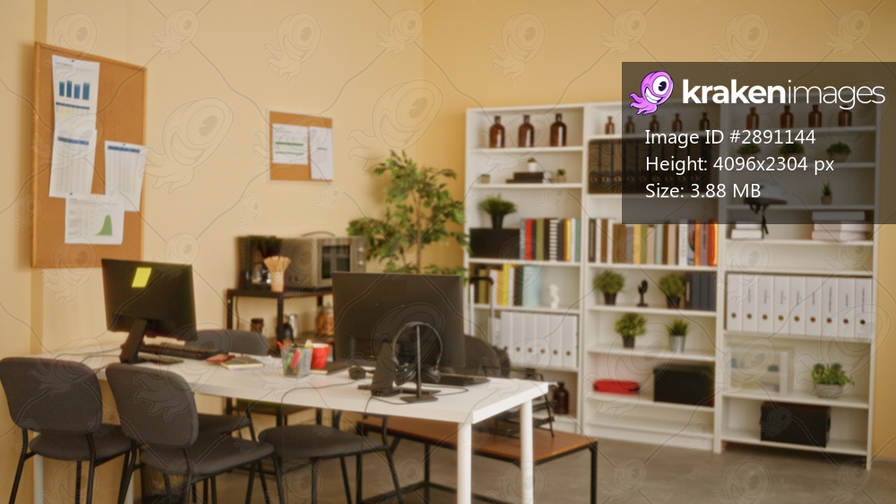 Blurred office interior with shallow bokeh on desks and shelving, soft warm tones and muted details suggesting workspace and storage; background backplate copyspace calm.