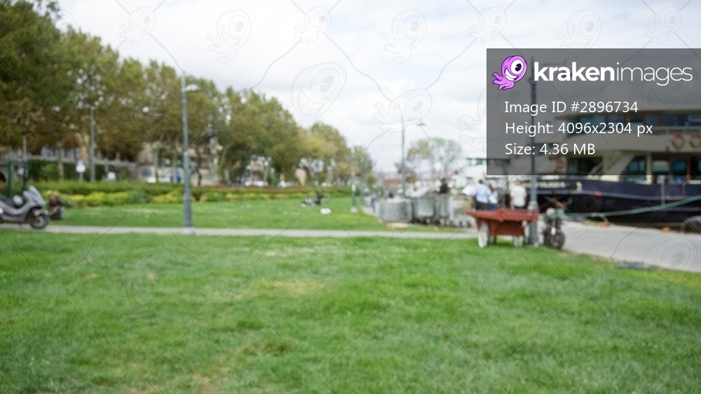 Blurred park scene with grassy foreground, lamp posts and waterfront boat softly out of focus; backplate copyspace calm.