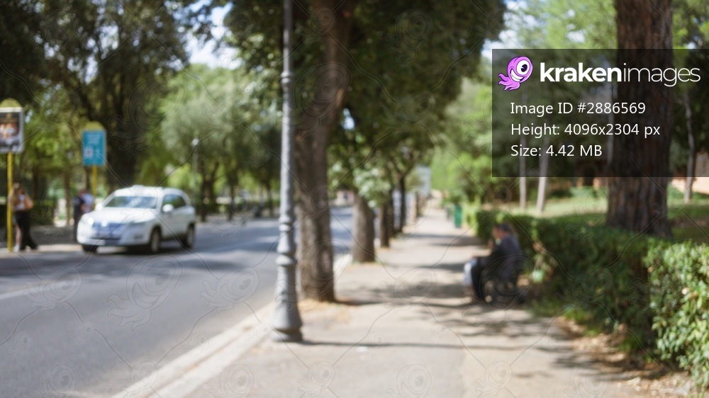 Blurred park sidewalk with soft bokeh and shallow defocus, lamppost and hedge out of focus; background backplate copyspace calm.