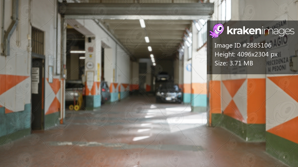 Blurred parking corridor with painted orange and white walls, tiled floor and distant vehicles, softly defocused interior; backplate copyspace template.