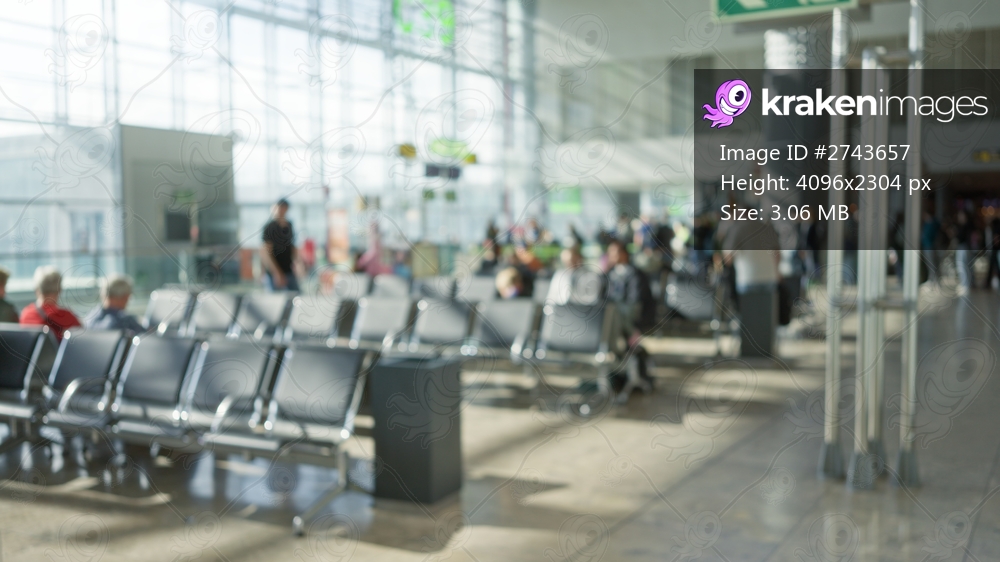 Blurred passengers seated in terminal with bright sunlight streaming through large windows, conveying a busy airport atmosphere, highlighting travel and waiting experiences. - Kraken Images