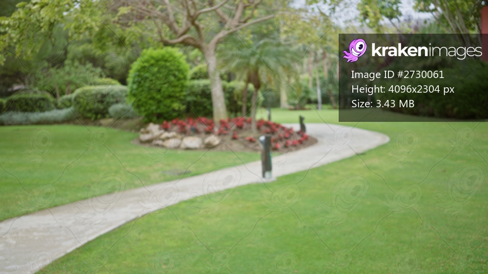 Blurred path leading through a lush, tropical garden in a luxury resort with vibrant greenery and flowers providing a serene and peaceful outdoor setting. - Kraken Images