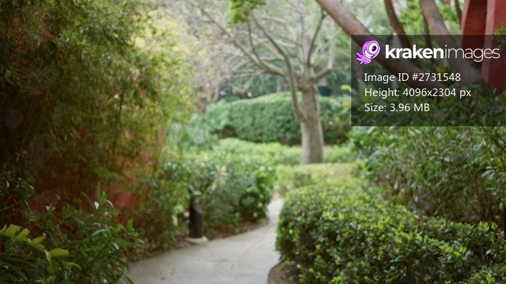 Blurred pathway in tropical resort garden with lush greenery and soft bokeh, creating a peaceful, serene outdoor atmosphere in a luxury hotel setting.