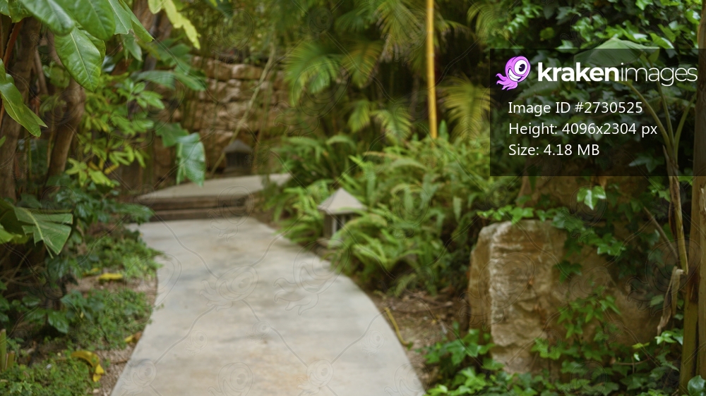 Blurred pathway surrounded by lush tropical greenery at a luxury resort, featuring defocused tropical plants and stone decorations in an outdoor setting. - Kraken Images
