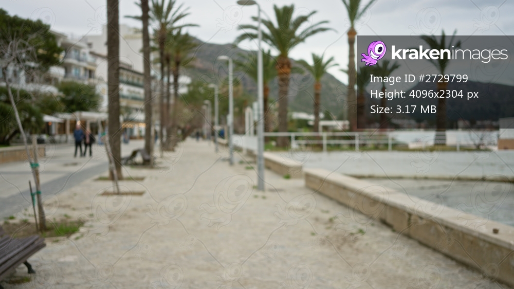Blurred promenade scene with people walking on a mediterranean path in mallorca, featuring palm trees, distant mountains, and a leisure atmosphere.