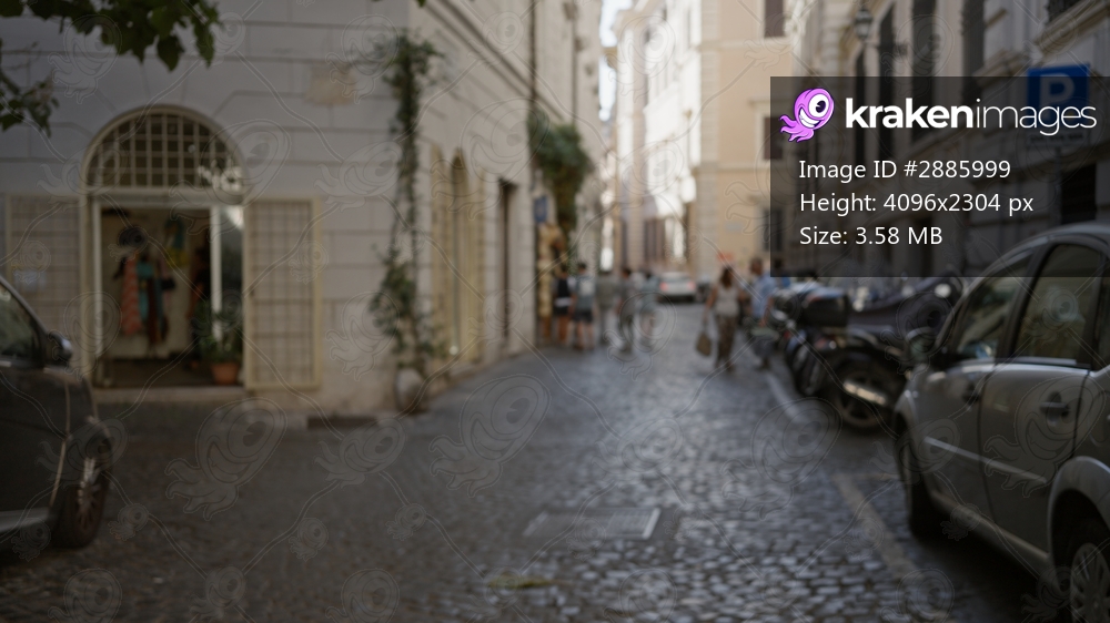 Blurred rome street scene with shallow bokeh, defocused cobblestone and parked cars; background backplate copyspace calm.