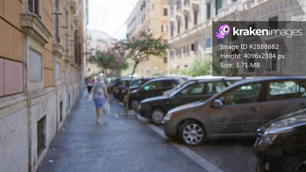Blurred rome street scene with shallow bokeh focus, parked cars and historic facades along a sunlit sidewalk; background backdrop copyspace calm.