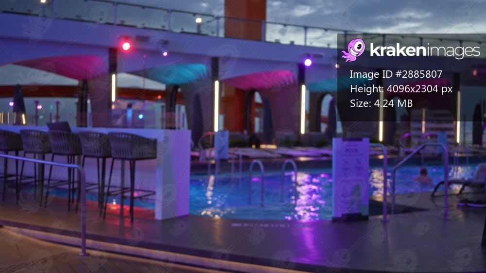 Blurred rooftop pool deck with neon lights, lounge chairs and bar seating, defocused bokeh outdoor; background backdrop copyspace calm.