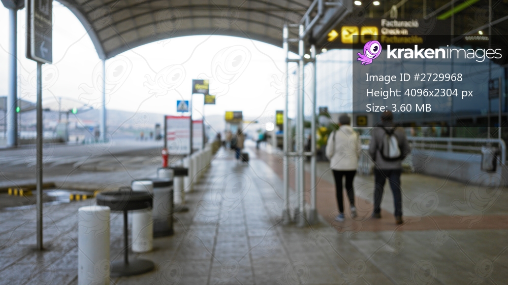 Blurred scene at airport terminal with man and woman walking towards entrance in defocused foreground, showcasing bokeh effect and modern architecture in outdoor setting. - Kraken Images