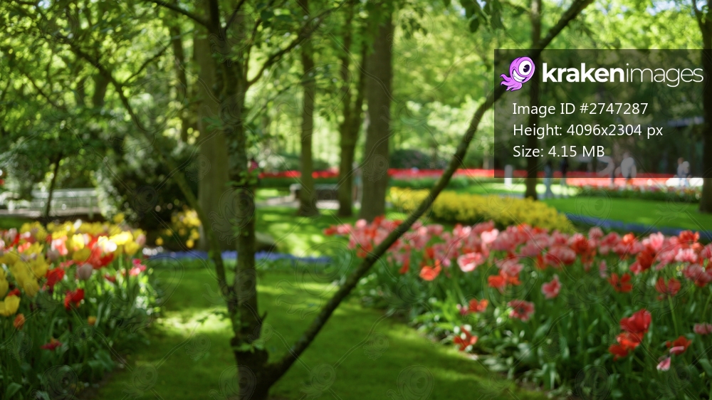 Blurred scene in a green park with colorful flowers featuring tulips and trees under sunlight in spring, where people are walking in the background out of focus. - Kraken Images