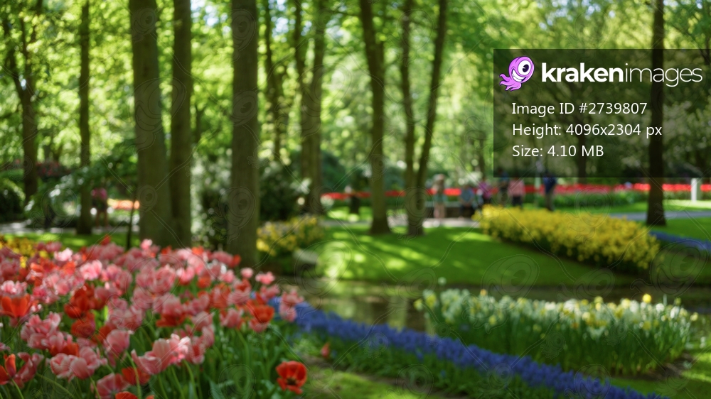 Blurred scene in a vibrant park featuring a variety of blooming flowers and lush greenery with people in the distance creating a serene and peaceful atmosphere. - Kraken Images