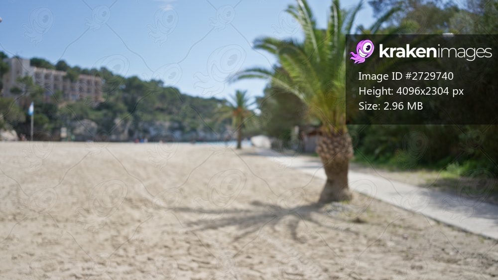 Blurred scene of a quiet beach in santanyi, mallorca featuring palm trees and a sandy path with defocused background showcasing mediterranean seaside and greenery. - Kraken Images