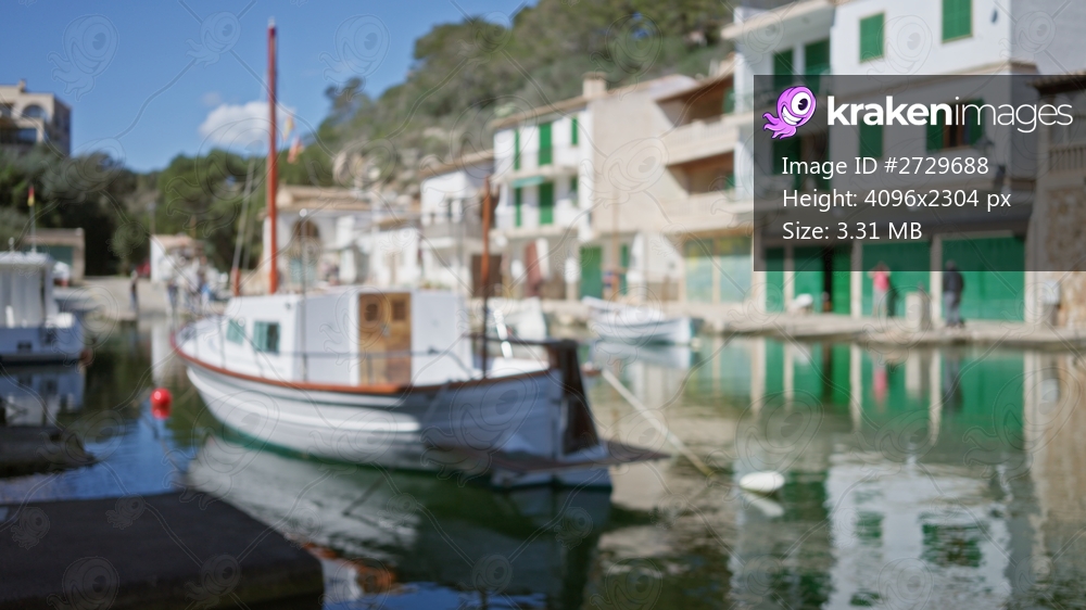 Blurred scene of boats in cala figuera port, mallorca, with defocused houses and people in the background, capturing the serene coastal ambiance.