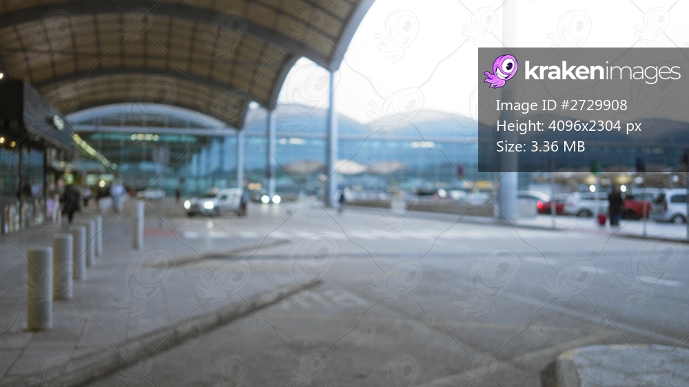 Blurred scene of people moving through defocused airport terminal with cars and modern architecture under large archway roof.