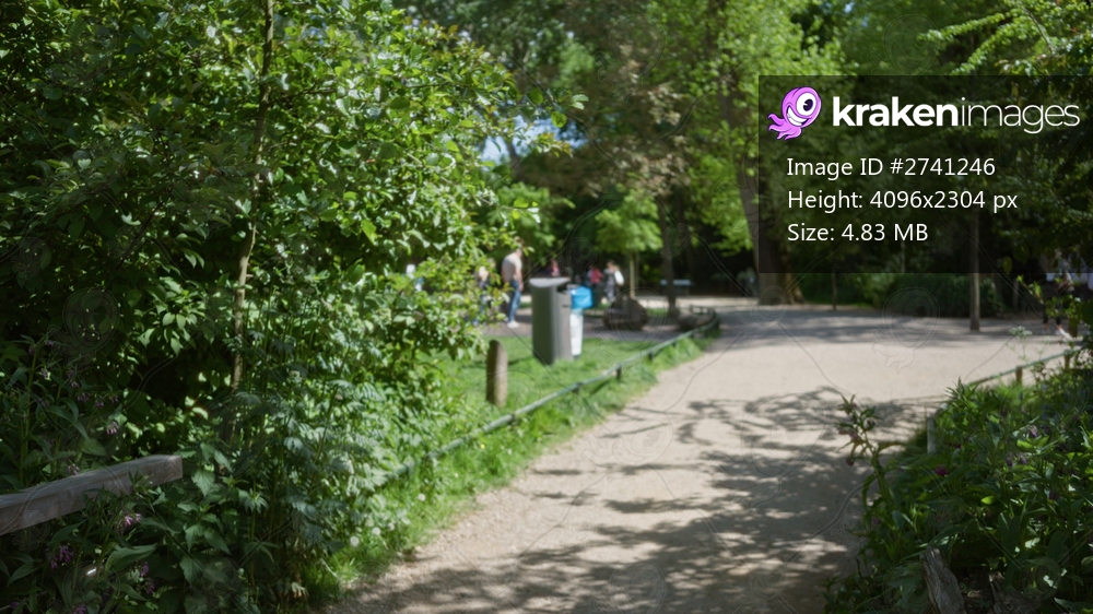 Blurred scene of people walking in a green park with flowers, showcasing a tranquil atmosphere with trees, sunshine, and a defocused background creating a bokeh effect. - Kraken Images