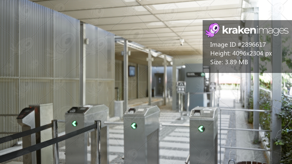 Blurred stainless steel turnstiles and entry lanes in a station with shallow focus; background backdrop copyspace.