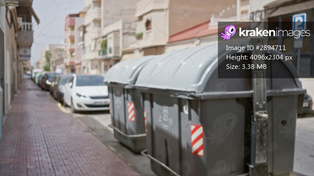 Blurred street scene with defocused dumpsters, parked cars and tiled sidewalk in shallow focus; background backplate copyspace template.