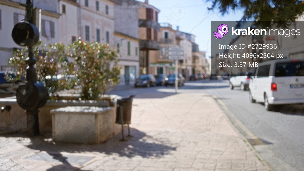 Blurred street scene in a mediterranean old town with bokeh effect showcasing a defocused background of buildings and pedestrians on a sunny day.