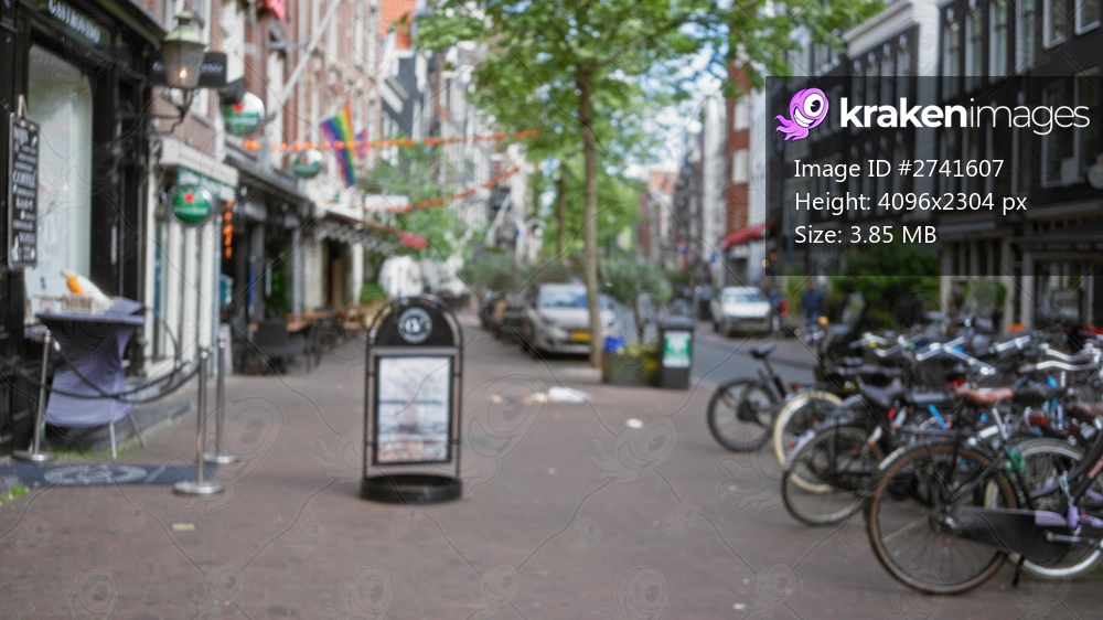 Blurred street scene in amsterdam with out-of-focus bicycles and cafes along a narrow city sidewalk, creating a vibrant urban atmosphere in the netherlands. - Kraken Images