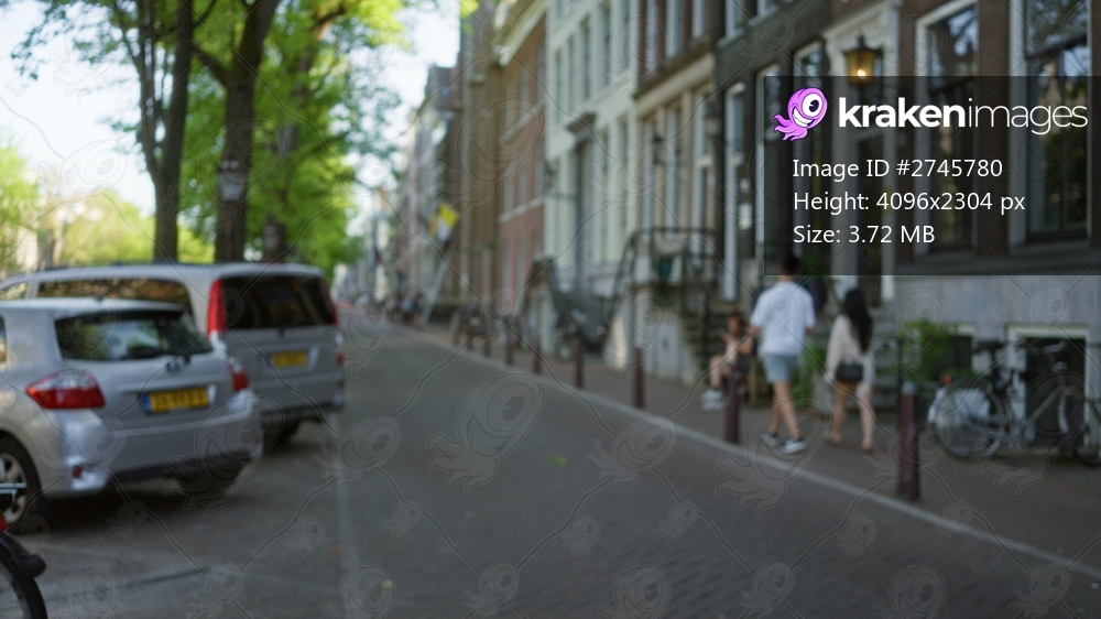 Blurred street scene with people walking in a european city, featuring trees, parked cars with dutch plates, bicycles, and historical architecture, capturing urban life and movement. - Kraken Images