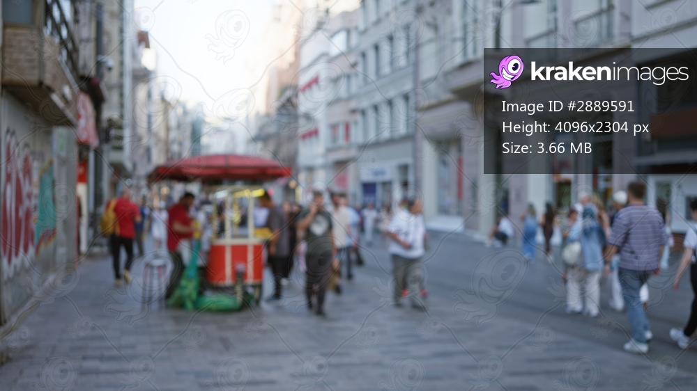 Blurred street scene with shallow bokeh and soft defocused storefront architecture, distant lights and paved foreground; background backdrop copyspace. - Kraken Images