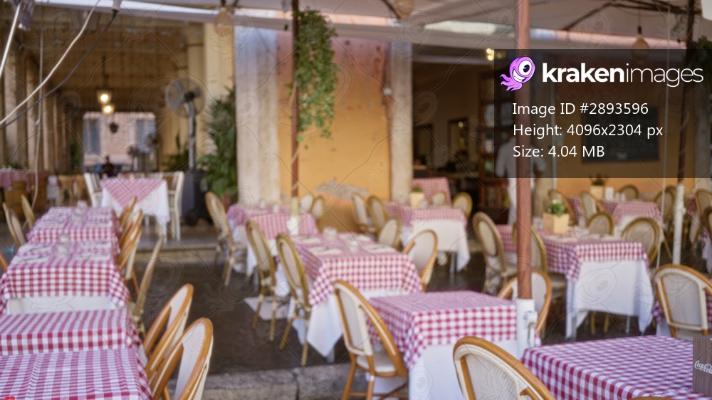 Blurred tables and chairs in soft bokeh with red gingham tablecloths, sunlit terrace elements and shallow focus near a warm stone facade, cafe; background copyspace. - Kraken Images