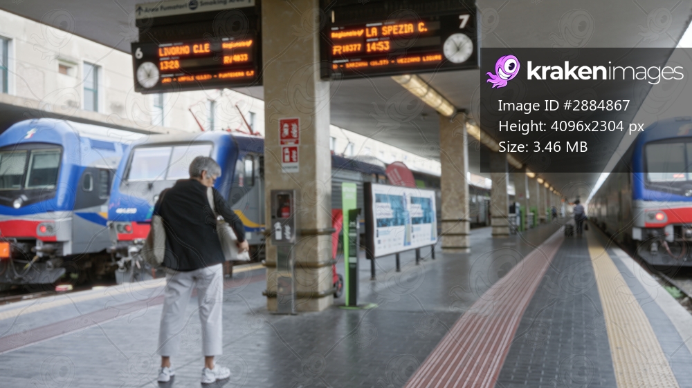 Blurred train station with shallow focus on tiled walkway, pillars and distant trains; background backplate copyspace template.