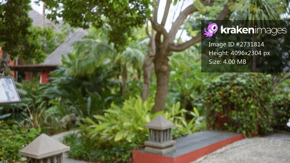 Blurred tropical resort with lush greenery and outdoor scenery, featuring defocused trees and plants creating a serene luxury atmosphere with bokeh effect. - Kraken Images
