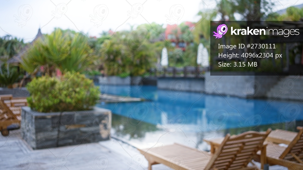 Blurred tropical resort scene with defocused wooden loungers by a luxury pool surrounded by lush green plants in an outdoor paradise setting.