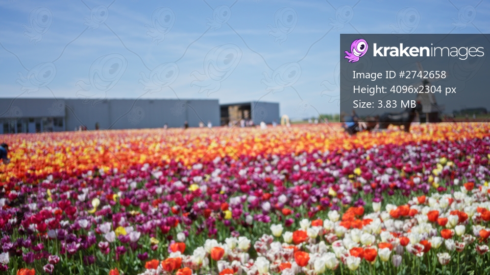 Blurred tulip field in netherlands with vibrant colors, windmill in background, defocused elements, and people enjoying the sunny day creates a picturesque scene. - Kraken Images