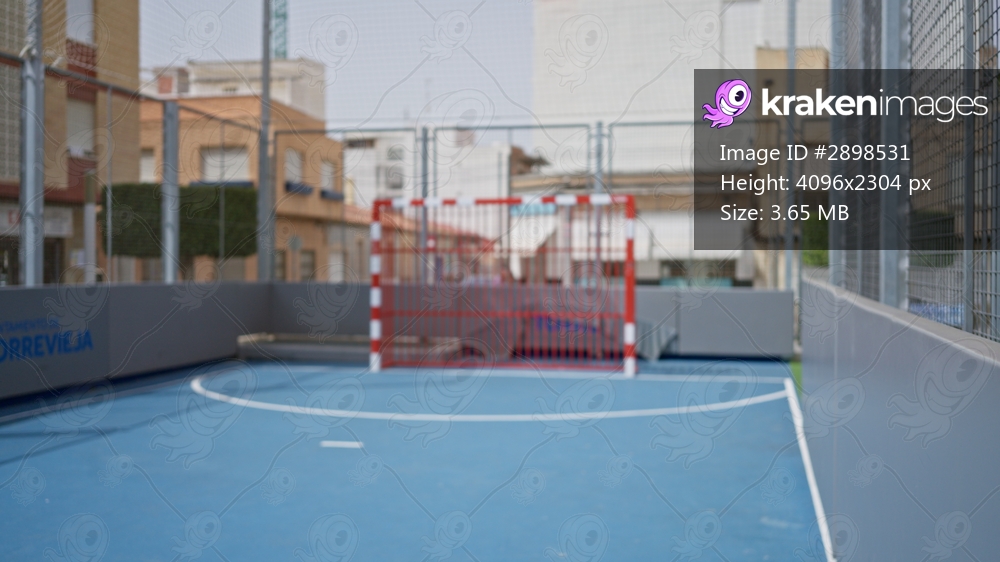 Blurred urban futsal court with red goal and fenced perimeter in soft defocused bokeh, outdoor; background backdrop copyspace calm.