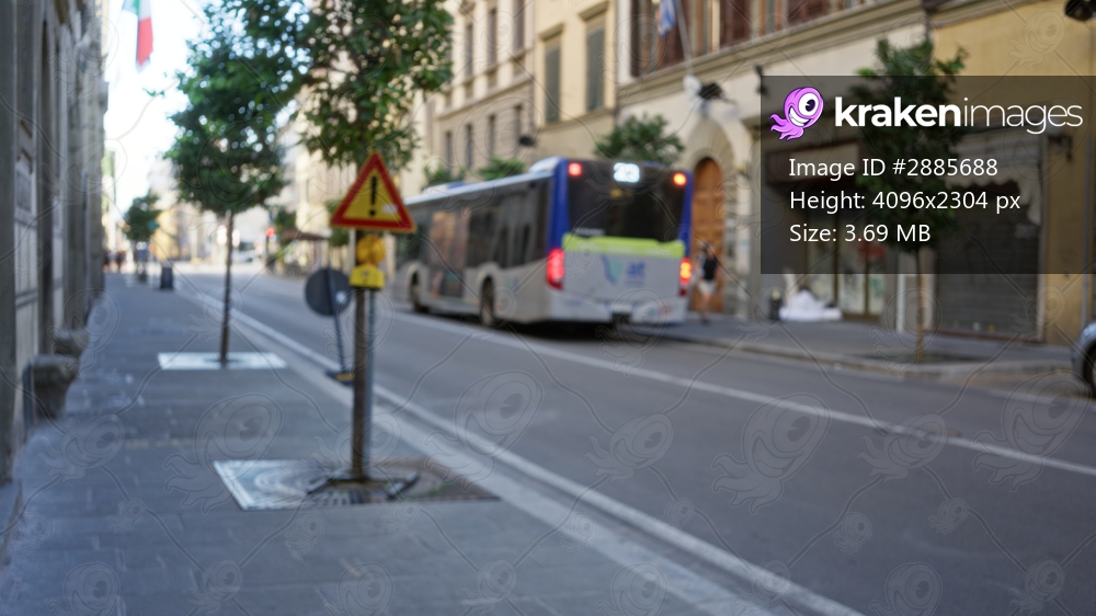 Blurred urban scene with shallow bokeh showing a passing bus, trees and sidewalk on a street; background backplate copyspace calm.