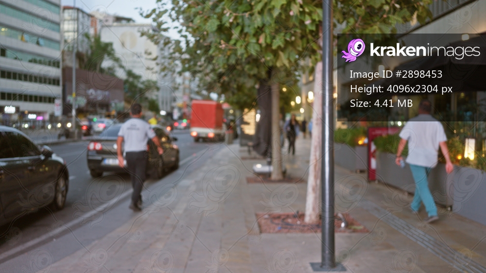 Blurred urban sidewalk with soft bokeh, defocused storefronts, trees and parked cars along a city street; background backdrop copyspace backplate.