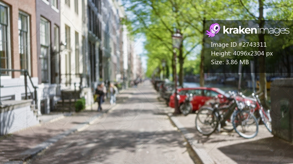Blurred urban street scene in amsterdam featuring defocused canal, trees, and row of parked bicycles with people walking along the picturesque cobblestone pathway in daylight. - Kraken Images