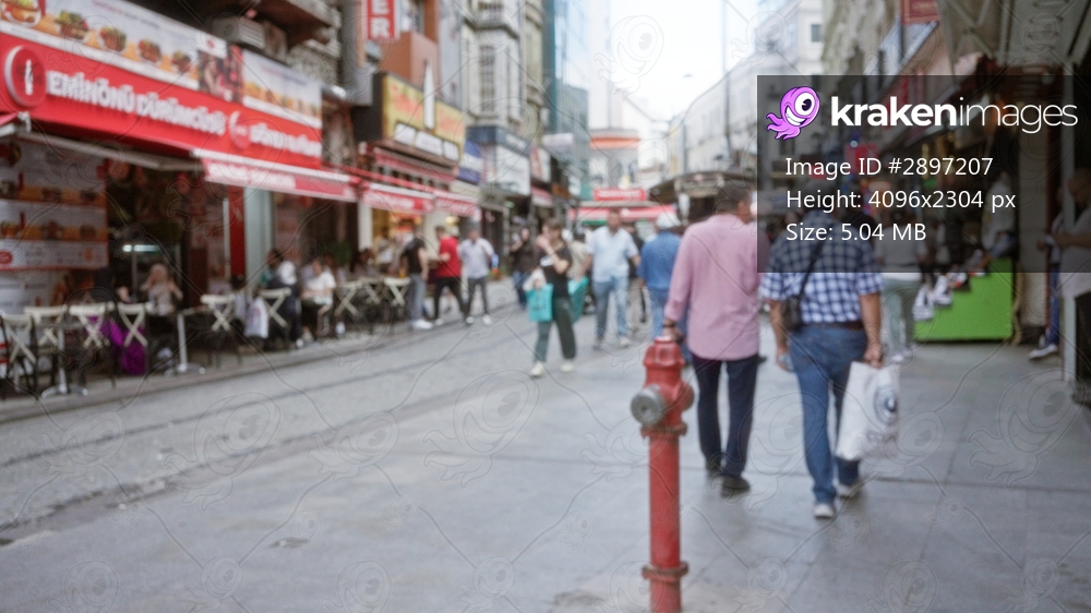 Blurred urban street scene with shallow bokeh focus on cafe storefronts, sidewalk and tram rails, soft defocused signage and pavement; background backdrop copyspace. - Kraken Images
