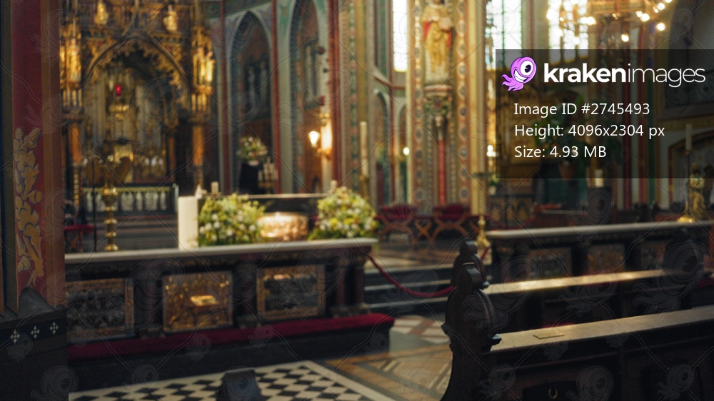 Blurred view of a beautifully ornate catholic church interior with elaborate altars, intricate decorations, and soft lighting creating a serene and sacred atmosphere. - Kraken Images