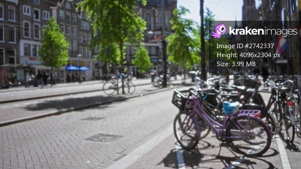 Blurred view of a busy amsterdam street with bicycles parked and vibrant greenery in the background, capturing a sunny cityscape in the netherlands.